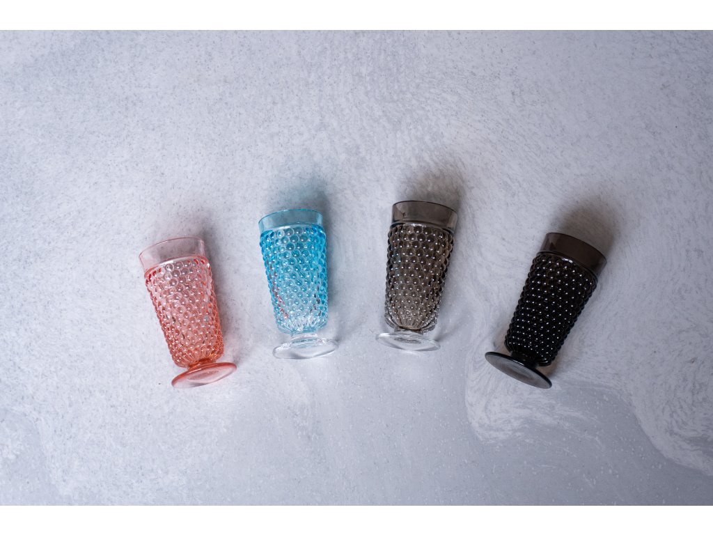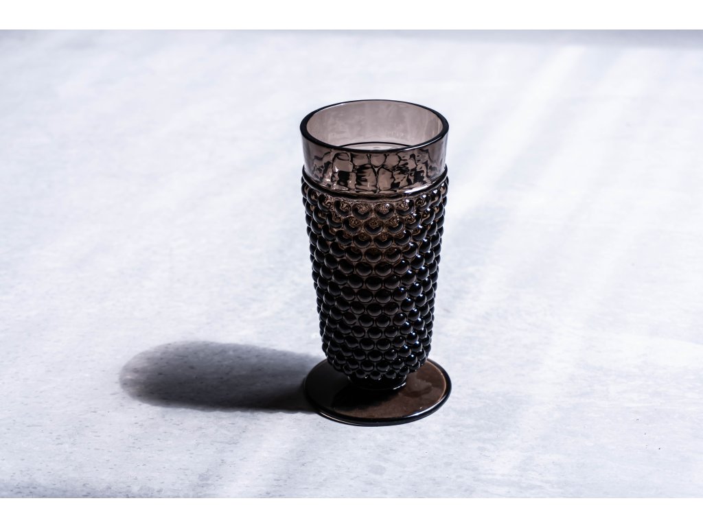 Be different from the crowd and take a unique twist on a timeless classic. Retro approach to the Bohemian glass tradition, our set of black smoke goblets, handcrafted, has an avant-garde hobnail design. This is not only bound to bring a bit of charm to your dining experience but also serves a very practical purpose, as it is comfortable and reassuring to hold.