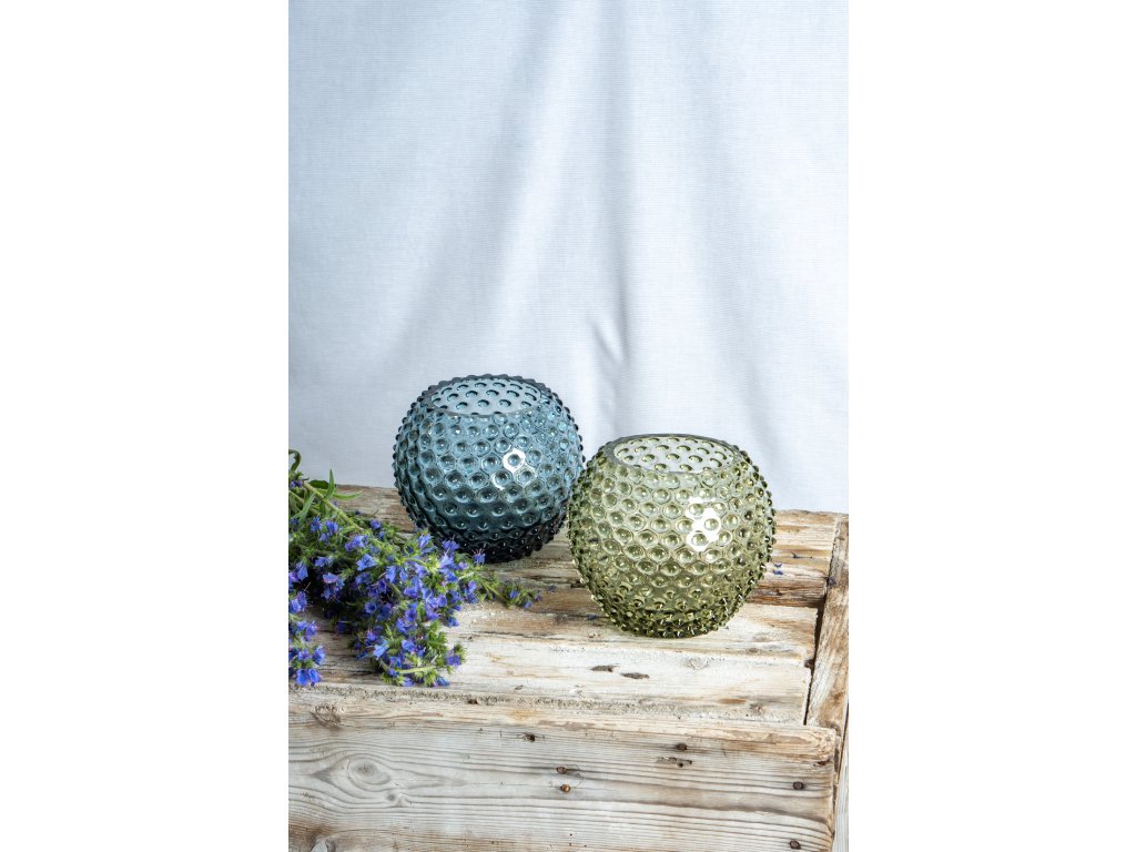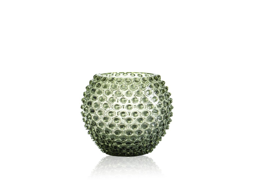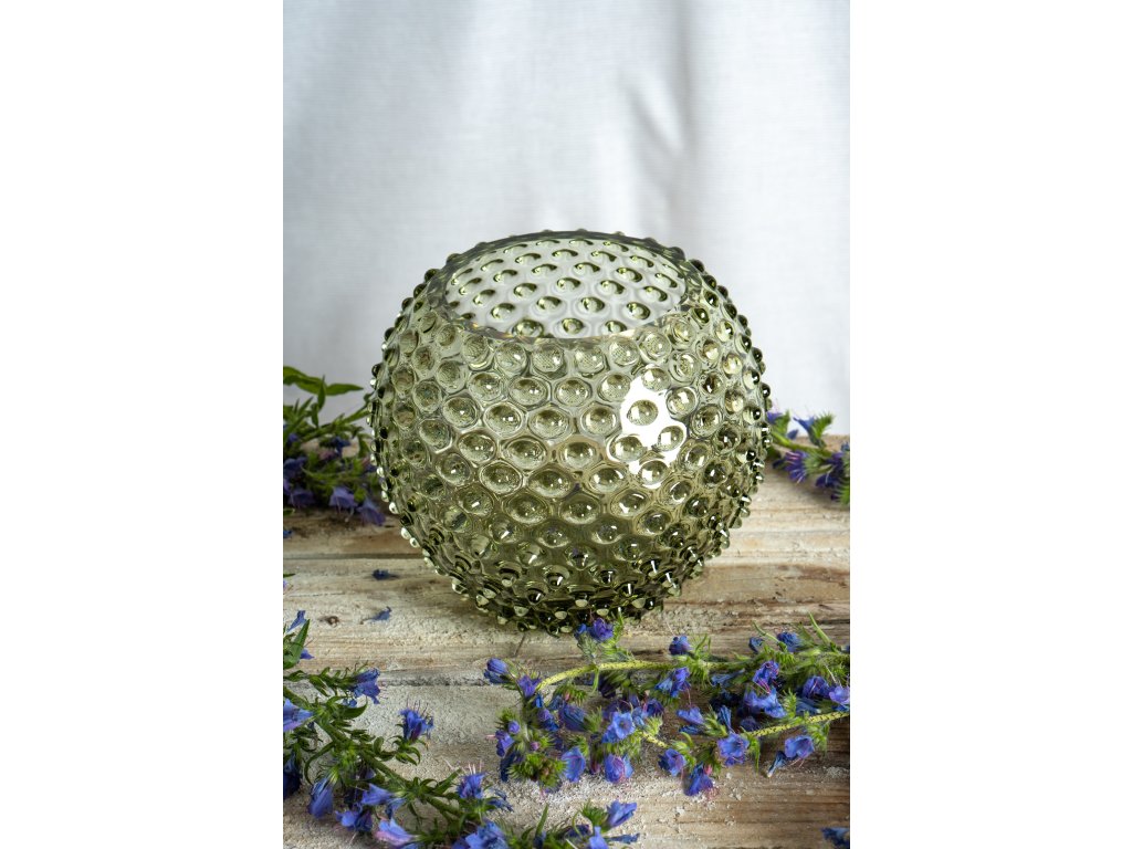 Olive Green Hobnail Vase - statement piece of glassware, this vase reflects the light in a beautiful way. Its unorthodox shape and bobbles make this vase a perfect fit for fresh flowers with short stems cut straight from your garden.